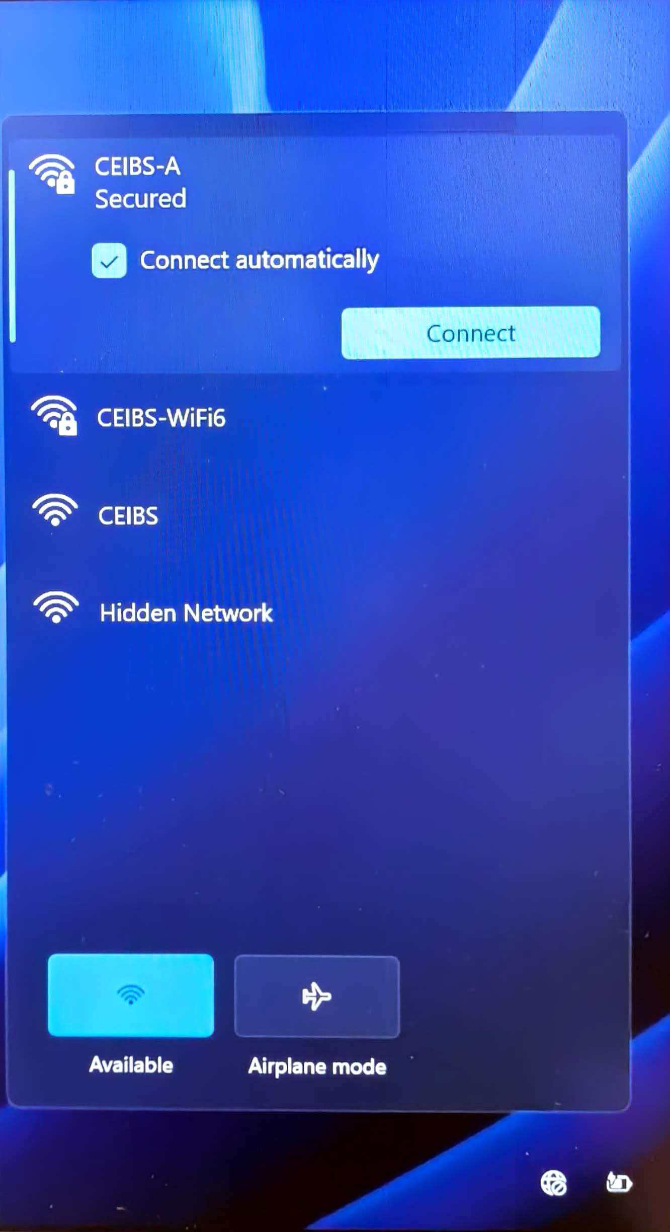 - On the Windows sign-in screen, click the wireless network icon in the lower-right corner(it displays a globe icon when there is no network connection). Connect to CEIBS-A or CEIBS-WiFi6 using your new password.