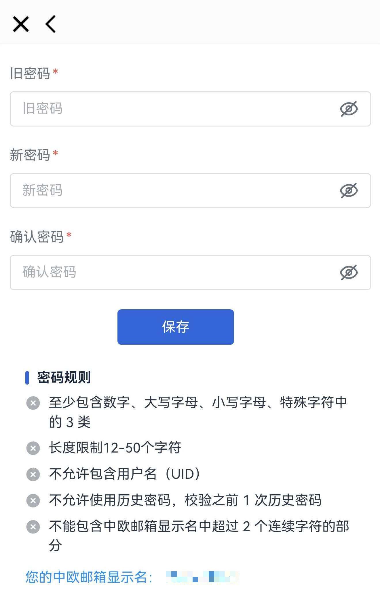 - 输入旧密码,根据密码规则输入新密码和确认密码,然后轻点 保存。
