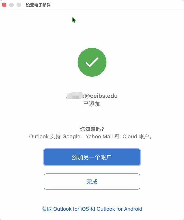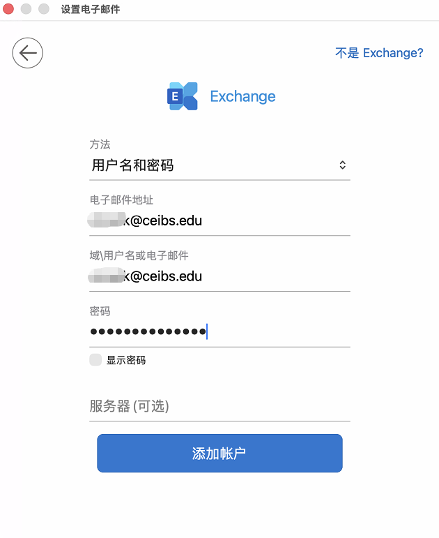 - 在 Outlook for Mac 中添加新帐户,请直接查看第2步,输入中欧邮箱地址。