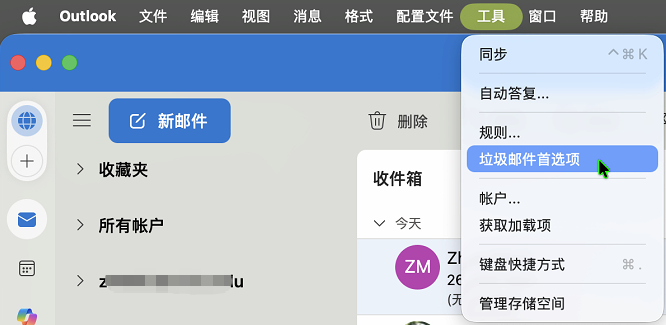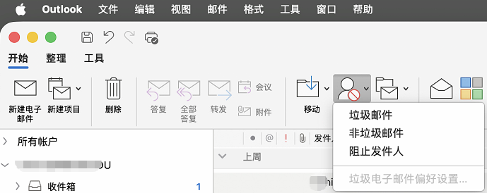 - 目前MacOS上的旧版Outlook中还无法直接查看或管理安全发件人列表,垃圾邮件菜单中的 阻止发件人 不可用,垃圾邮件菜单中的 垃圾邮件偏好设置 不可用 ,所以需要通过Windows电脑端或网页端的Outlook进行设置。
