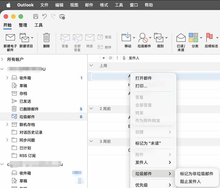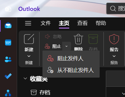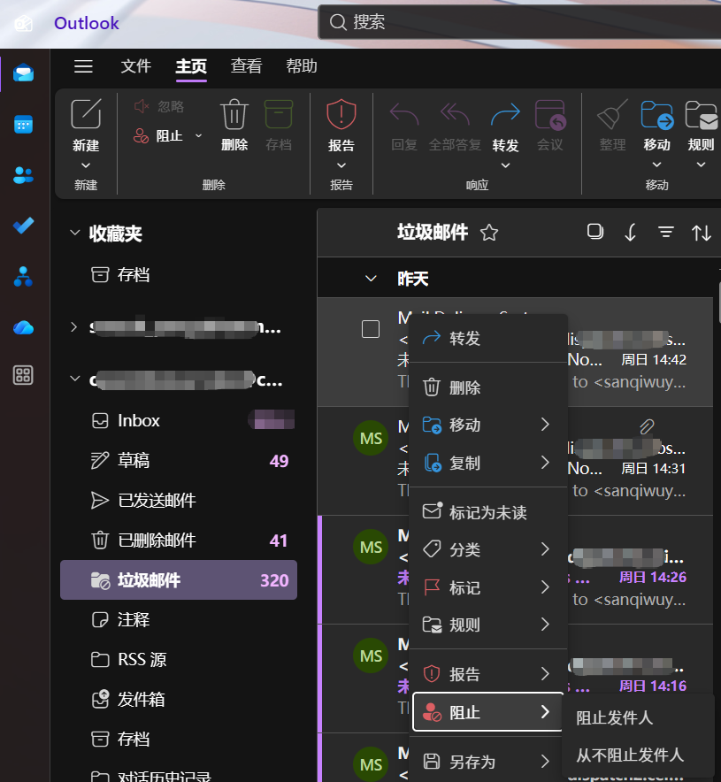 在任意邮件文件夹中,选中邮件,在顶部 开始>垃圾邮件 的菜单中或右键邮件的 垃圾邮件 的菜单中选择 阻止发件人。