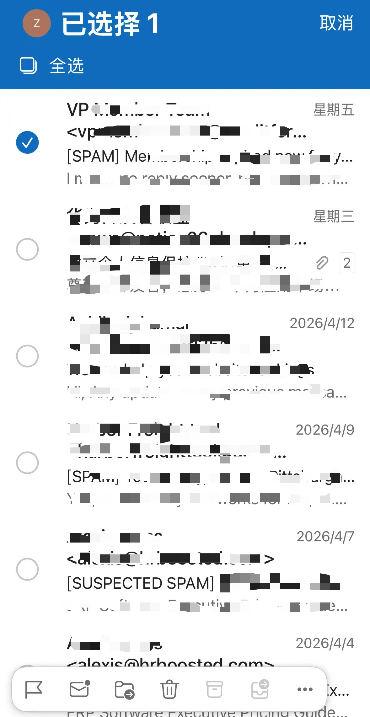 - 在垃圾邮件文件夹中,选中邮件并长按,轻点底部 三个点 的菜单按钮