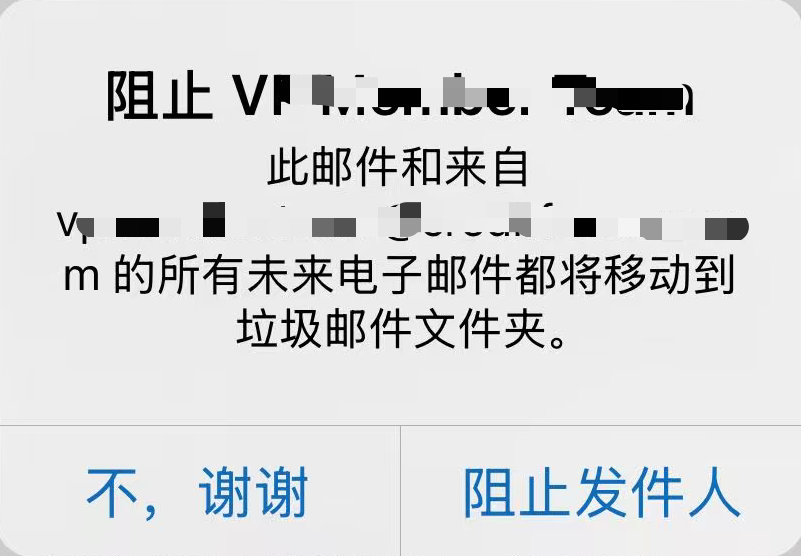 - 在弹出的窗口中,轻点 阻止发件人,这封邮件会被移动到 垃圾邮件(Junk Email)文件夹。
