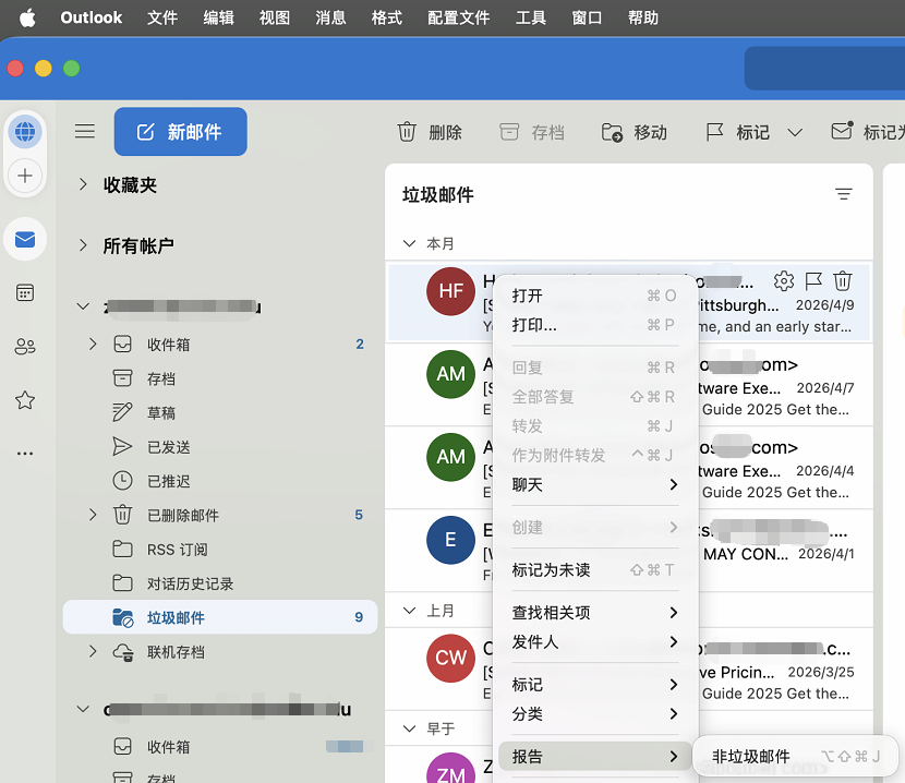 关于垃圾邮件的操作 - 在MacOS上的新版Outlook中