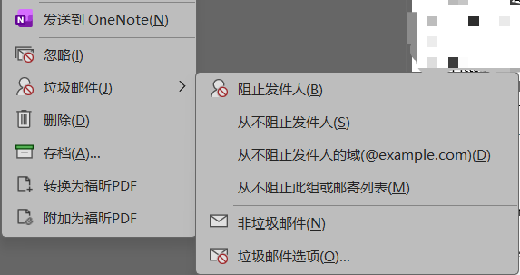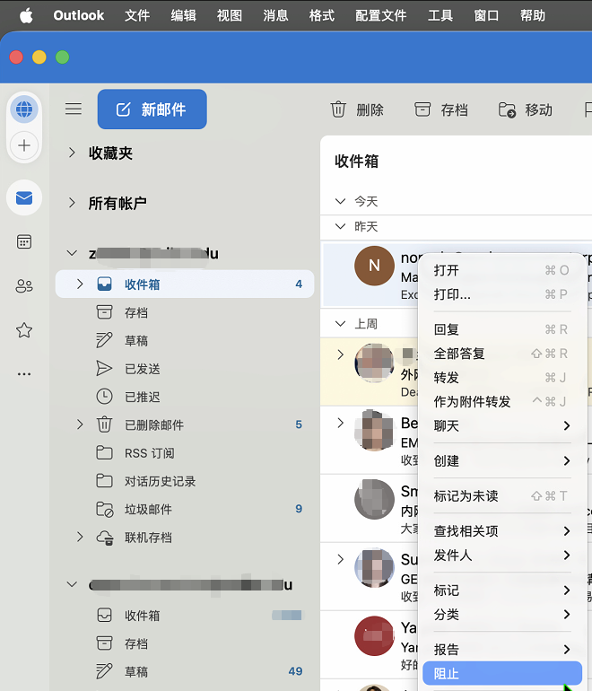 - 在除垃圾邮件文件夹外的其他任意邮件文件夹中,选中邮件,在右键邮件的菜单中选择 阻止。
