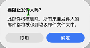 - 这封邮件会被删除,之后来自此发件人的邮件将被移动到垃圾邮件文件夹中。阻止发件人添加完成。