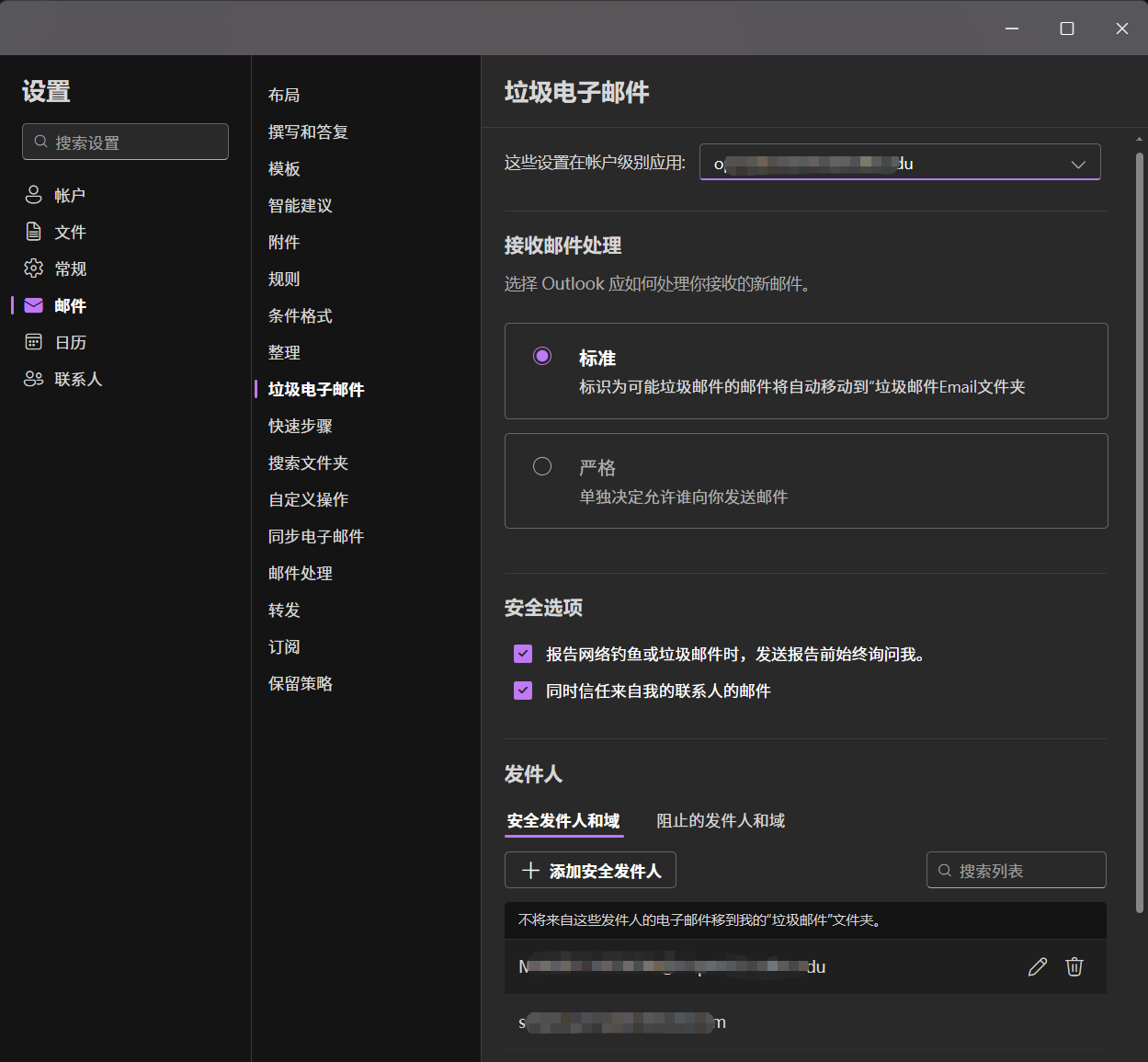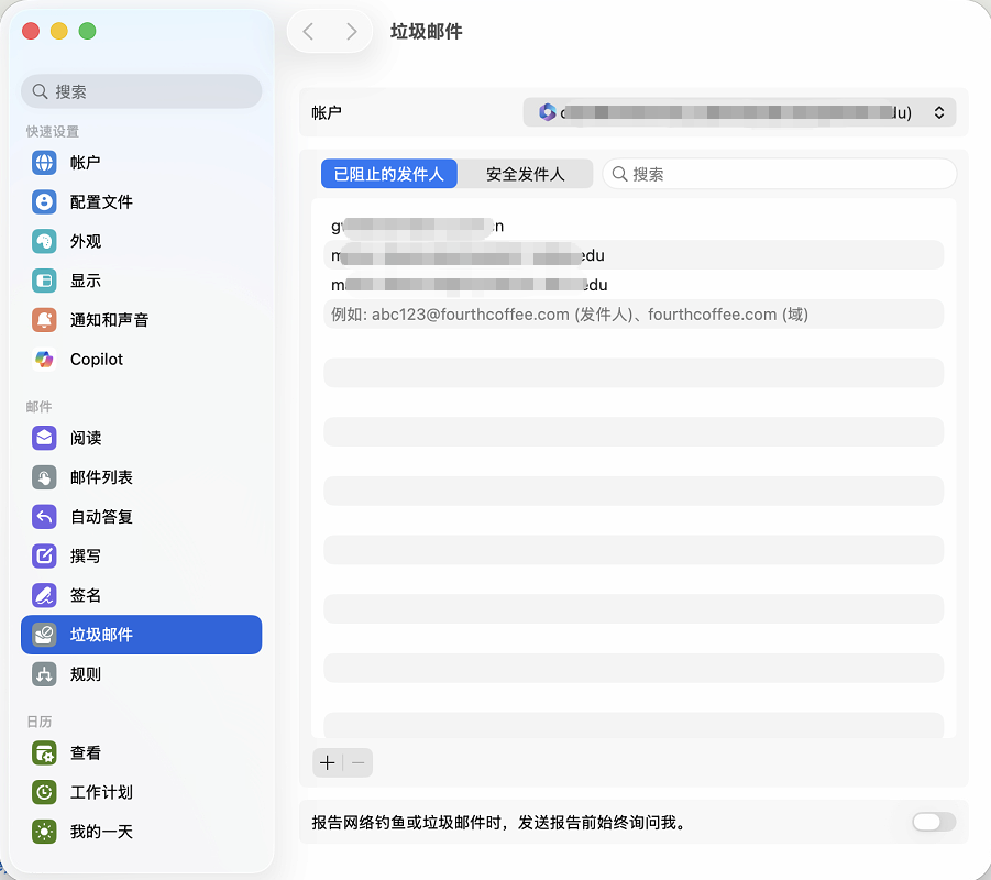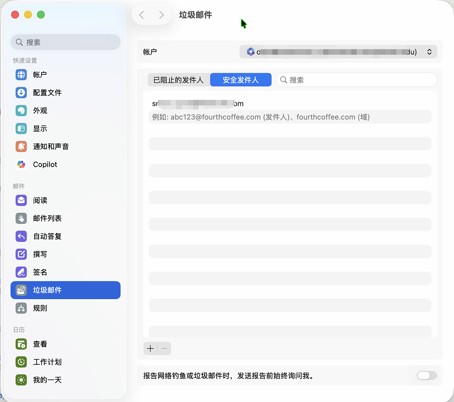 - 选择 垃圾邮件>安全发件人,使用底部的 加号➕ 进行添加 ,使用底部的 减号➖ 进行取消添加。