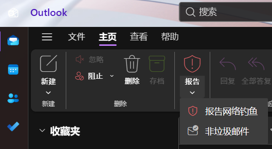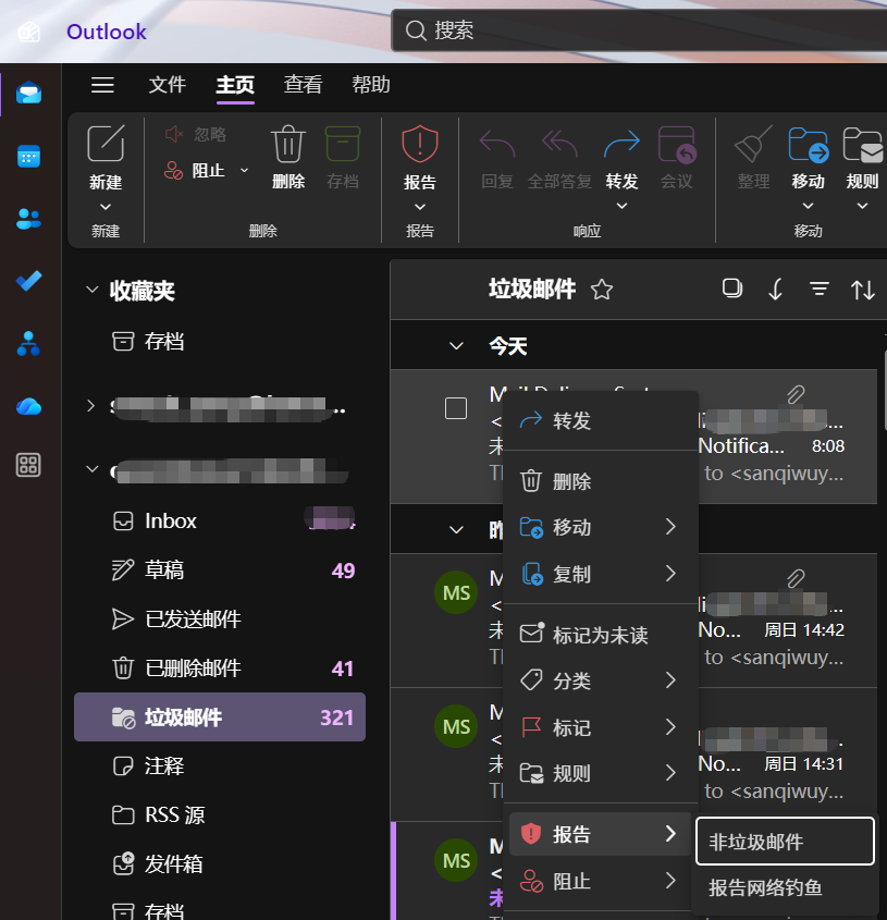 - 在垃圾邮件文件夹中,选中邮件,在顶部 主页>报告 的菜单中或右键邮件的 报告 的菜单中选择 非垃圾邮件。