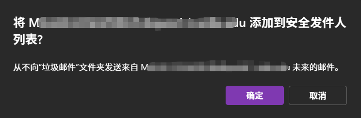 - 在 将xxx@xxx 添加到安全发件人列表 的弹出窗口中,并点击 确定,邮件发件人被添加到了白名单(安全发件人)中。
