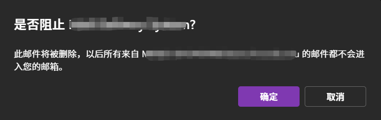 - 在 是否阻止xxx? 的弹出窗口中,并点击 确定,这封邮件会被删除,邮件发件人被添加到了黑名单(阻止发件人)中。