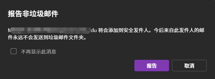 - 在 报告非垃圾邮件 的弹出窗口中,并点击 报告,这封邮件会被移回 收件箱(Inbox)文件夹,邮件发件人被添加到了白名单(安全发件人)中。