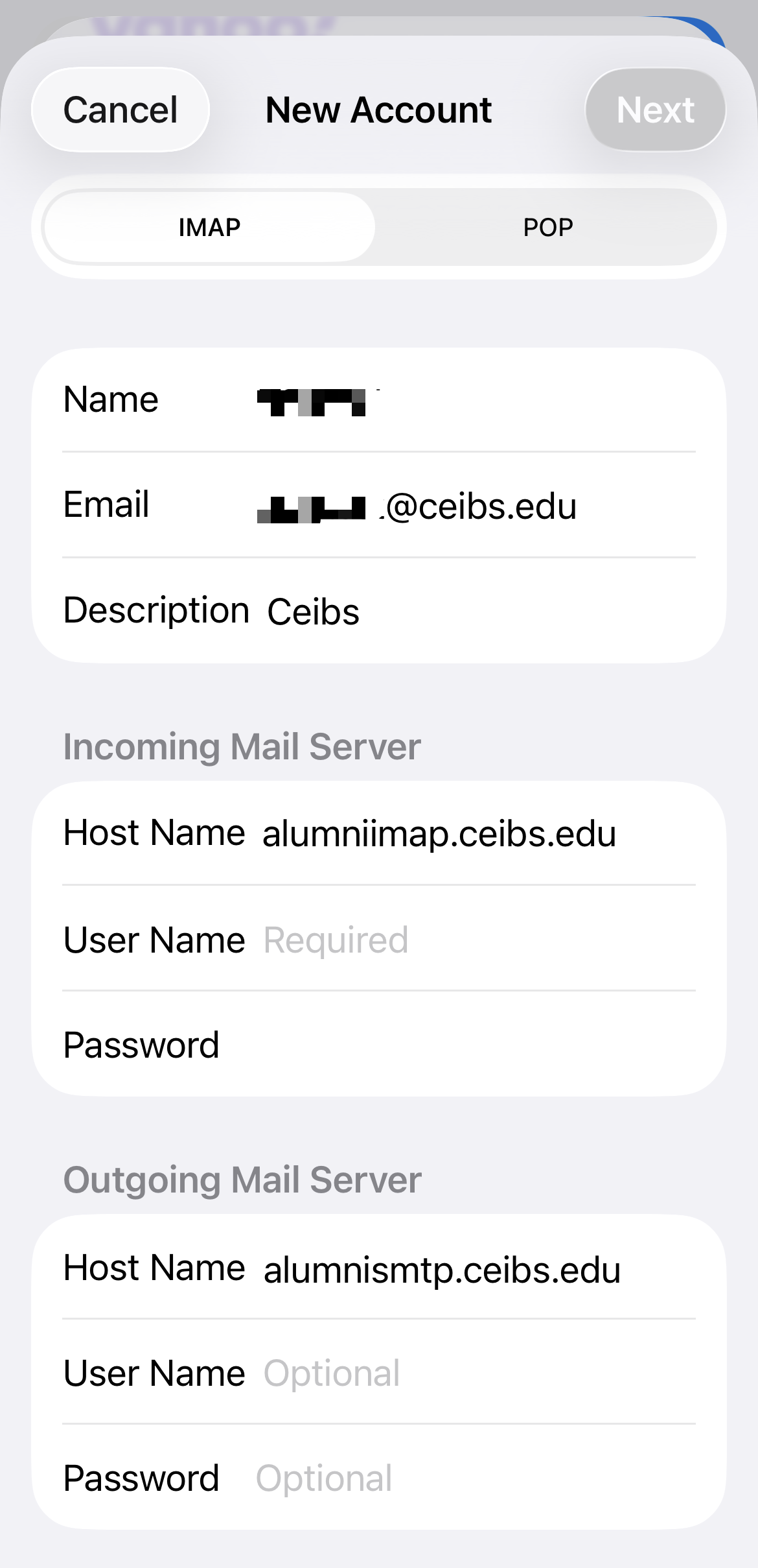 - Enter the display name of your CEIBS alumni email address in the Name field, enter the password for your CEIBS alumni email address in the 'Password' field, enter a description to help you identify which email account this is (e.g. CEIBS), and tap Next.