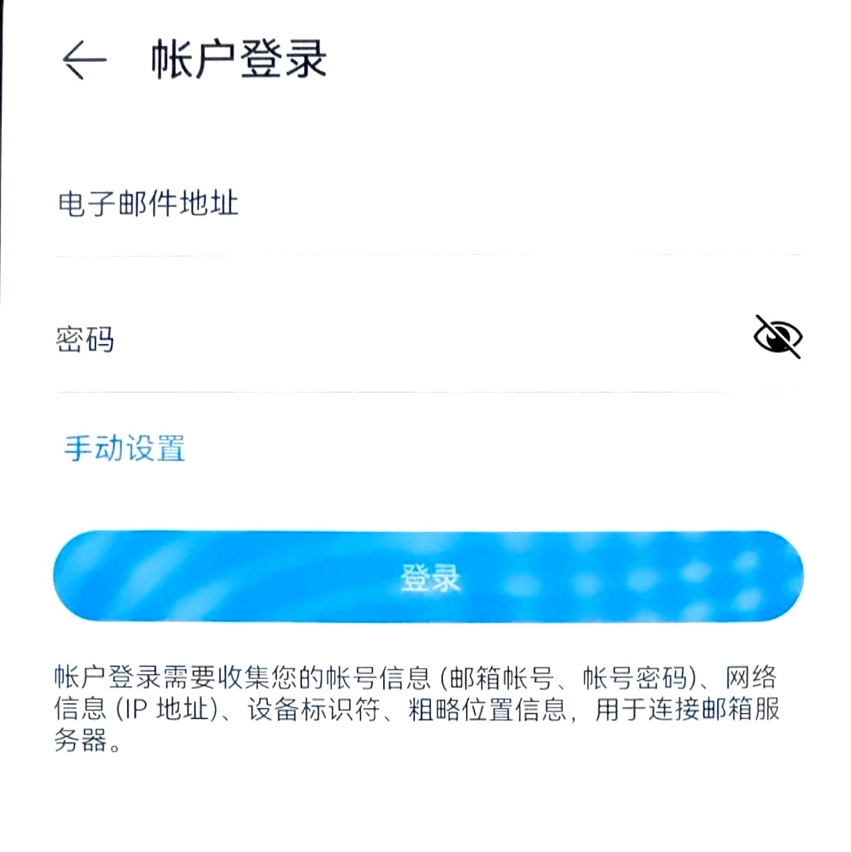 - 在电子邮件地址框中输入你中欧校友邮箱地址,在密码框中输入你中欧校友邮箱密码,轻点 手动设置。