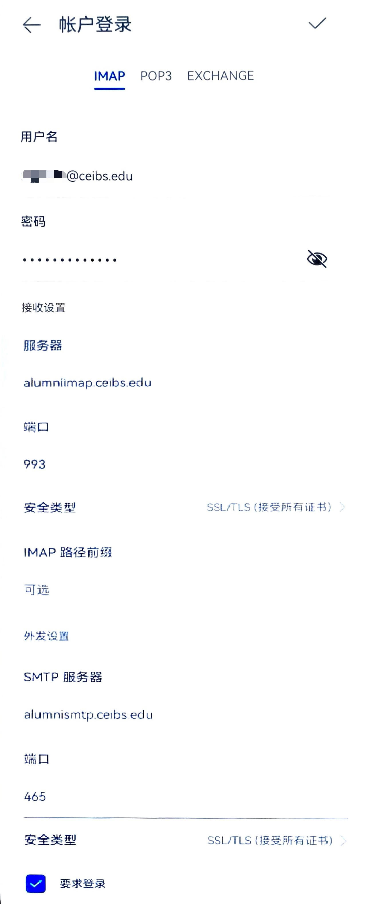 alumnismtp.ceibs.edu; - 用户名:你的中欧校友邮箱地址;