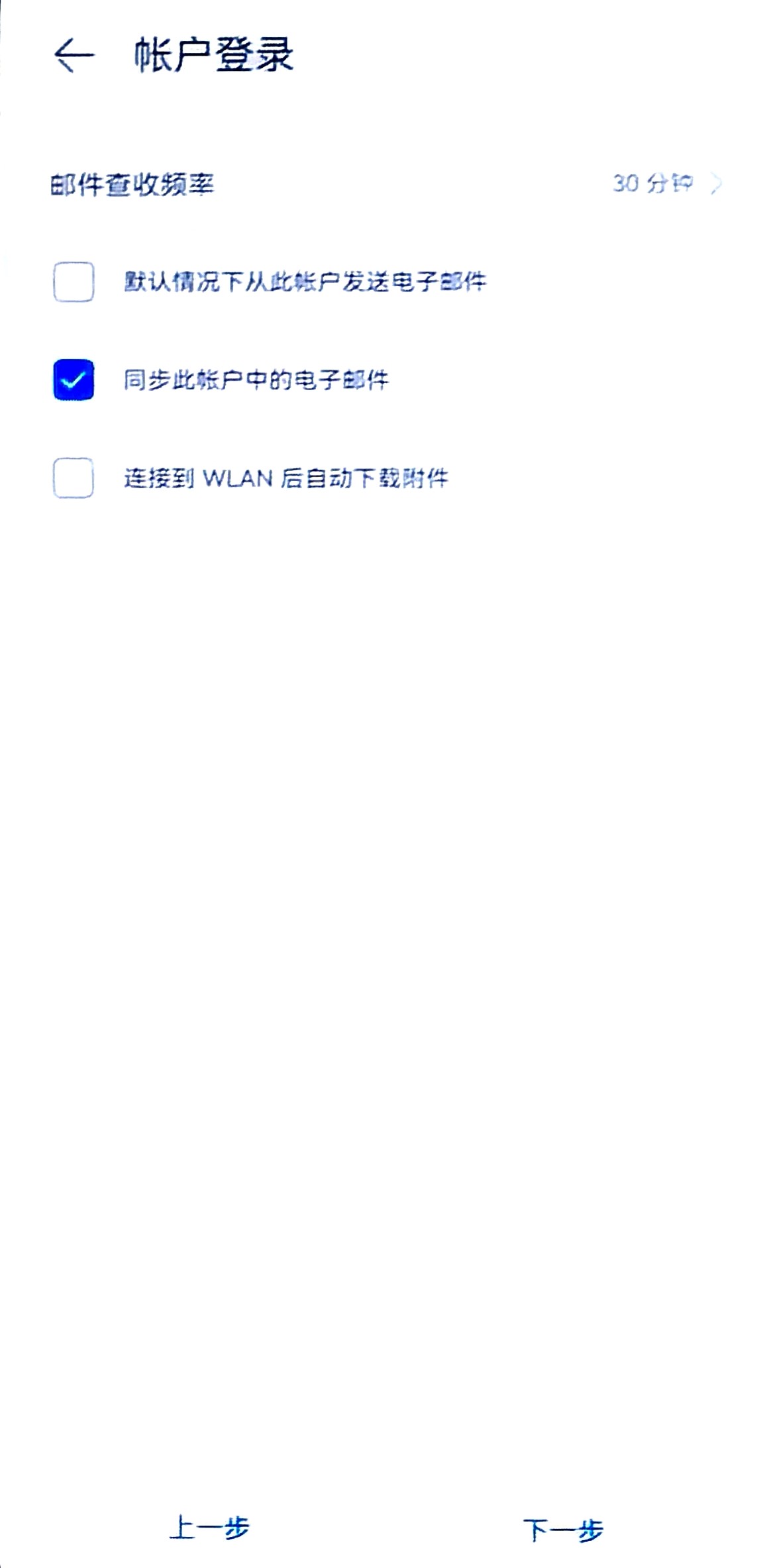 - 勾选 同步此帐户中的电子邮件,轻点 下一步。