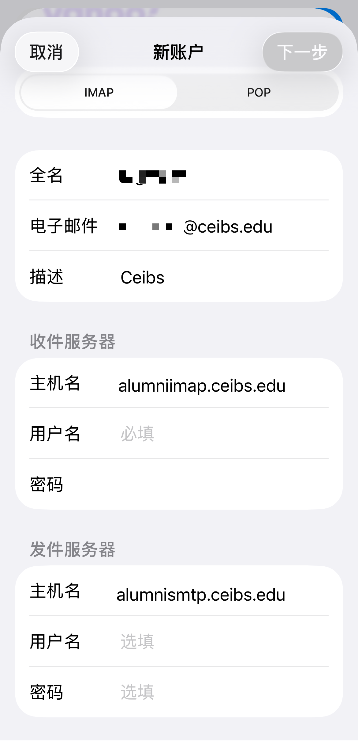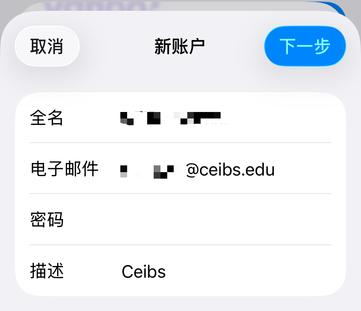 - 在全名框中输入你中欧校友邮箱的显示名,密码框中输入你中欧校友邮箱的密码,描述框中输入方便你自己区分这是什么邮箱(例如CEIBS),并轻点 下一步。