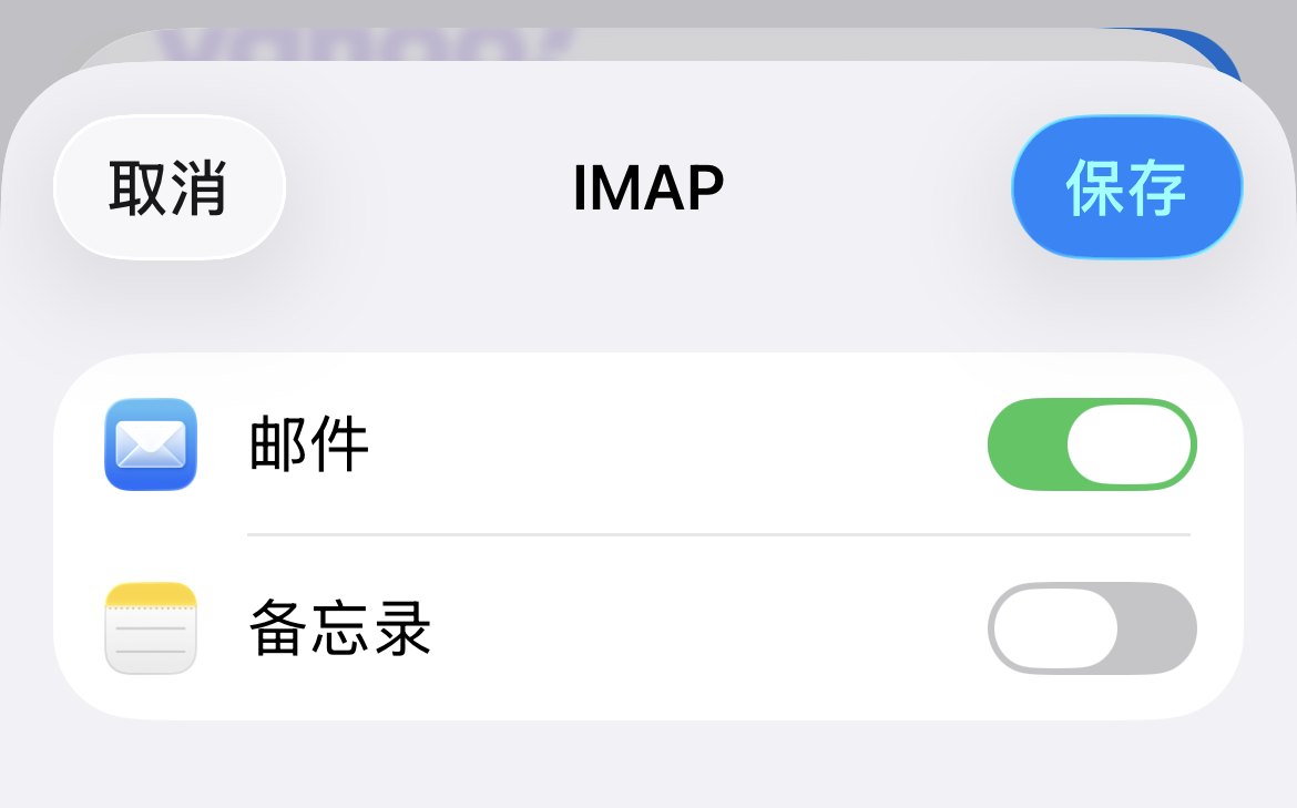 - 在帐户登录界面,选择 IMAP,在下方的接收设置和外发设置中按下面的内容输入,全部输入完成后轻点右上角打勾图标。