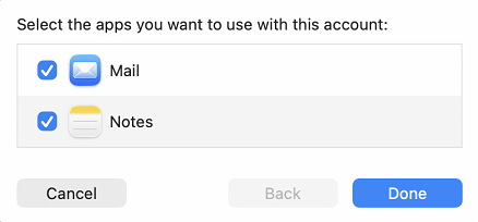 - After successful verification, you will be prompted to Select the apps you want to use with this account. You may check Mail and Notes. You can choose according to needs, then click Done.