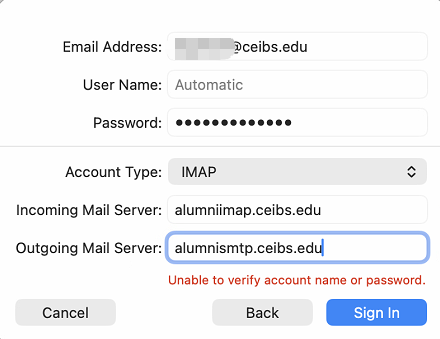- When sending an email for the first time, if you receive the message Mail cannot verify the identity of the server 'alumnismtp.ceibs.edu', select Continue.