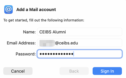 CEIBS provides email services for alumni. You can set it up in Mail app for desktop devices.