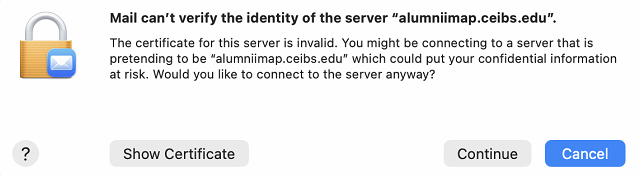 - If you receive the message Mail can't verify the identity of the server 'alumniimap.ceibs.edu', select Continue.