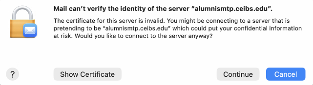 - If you receive the message Mail cannot verify the identity of the server 'alumnismtp.ceibs.edu', select Continue.