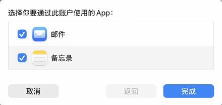 - 验证通过后,会提示 选择你要通过此账户使用的App,可勾选 邮件 和 备忘录。用户可以根据自己需要进行选择,最后选择 完成。