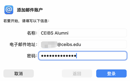 - 输入名称(比如CEIBS Alumni),电子邮件地址 区域输入 中欧校友邮箱地址,输入 密码 后选择 登录。