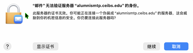 - 如果收到提示 ”邮件“无法验证服务器”alumnismtp.ceibs.edu"的身份,请选择 继续。