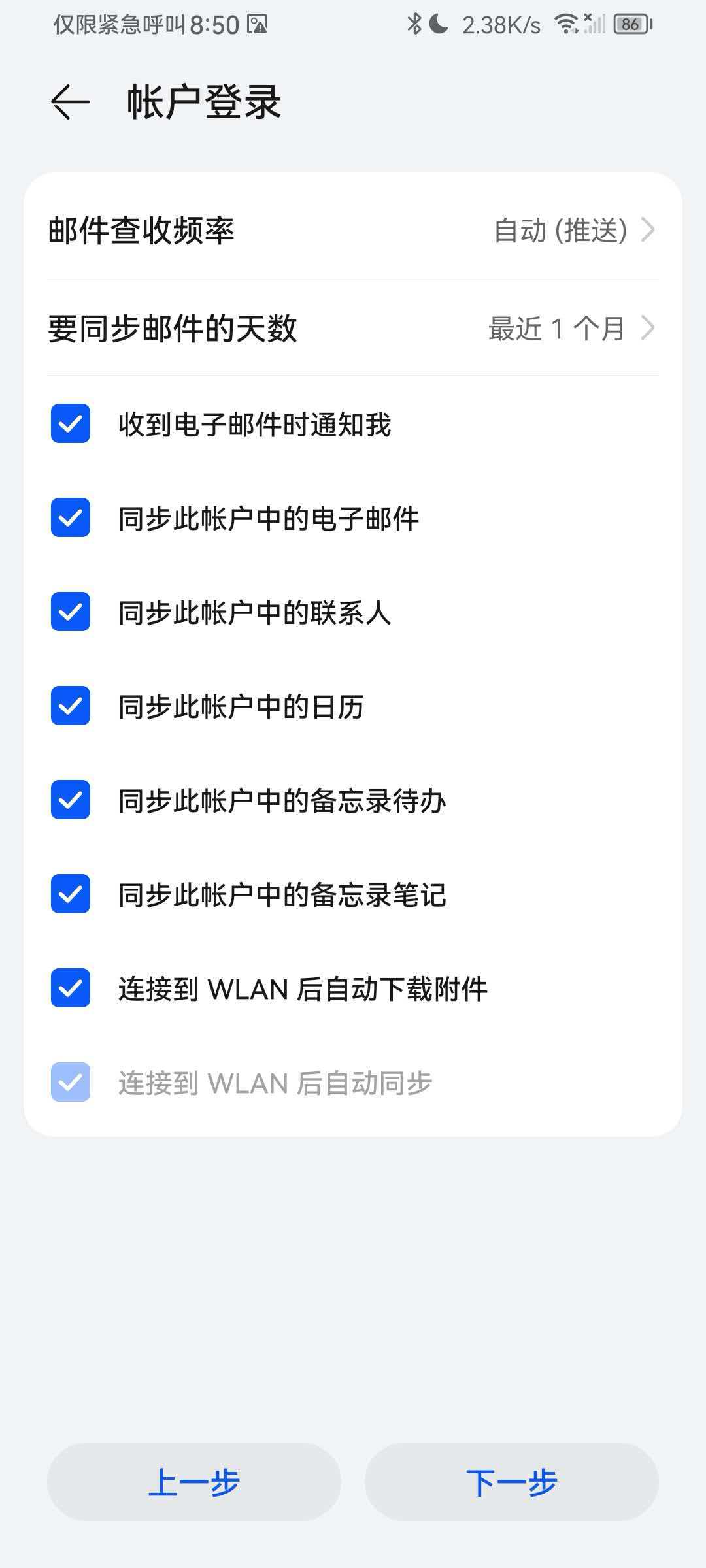 你可以同步邮件、通讯录、日历、备忘录代办和备忘录笔记等。还可以设置同步频率和天数。完成后,轻点下一步。