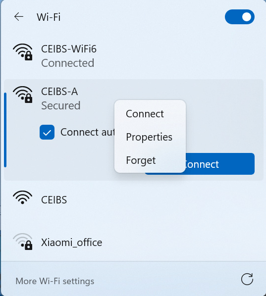 It is recommended that everyone switch to the CEIBS-WiFi6 network. If you have previously connected to the CEIBS-A network, please remove the CEIBS-A connection to enjoy the new Wi-Fi 6 experience.